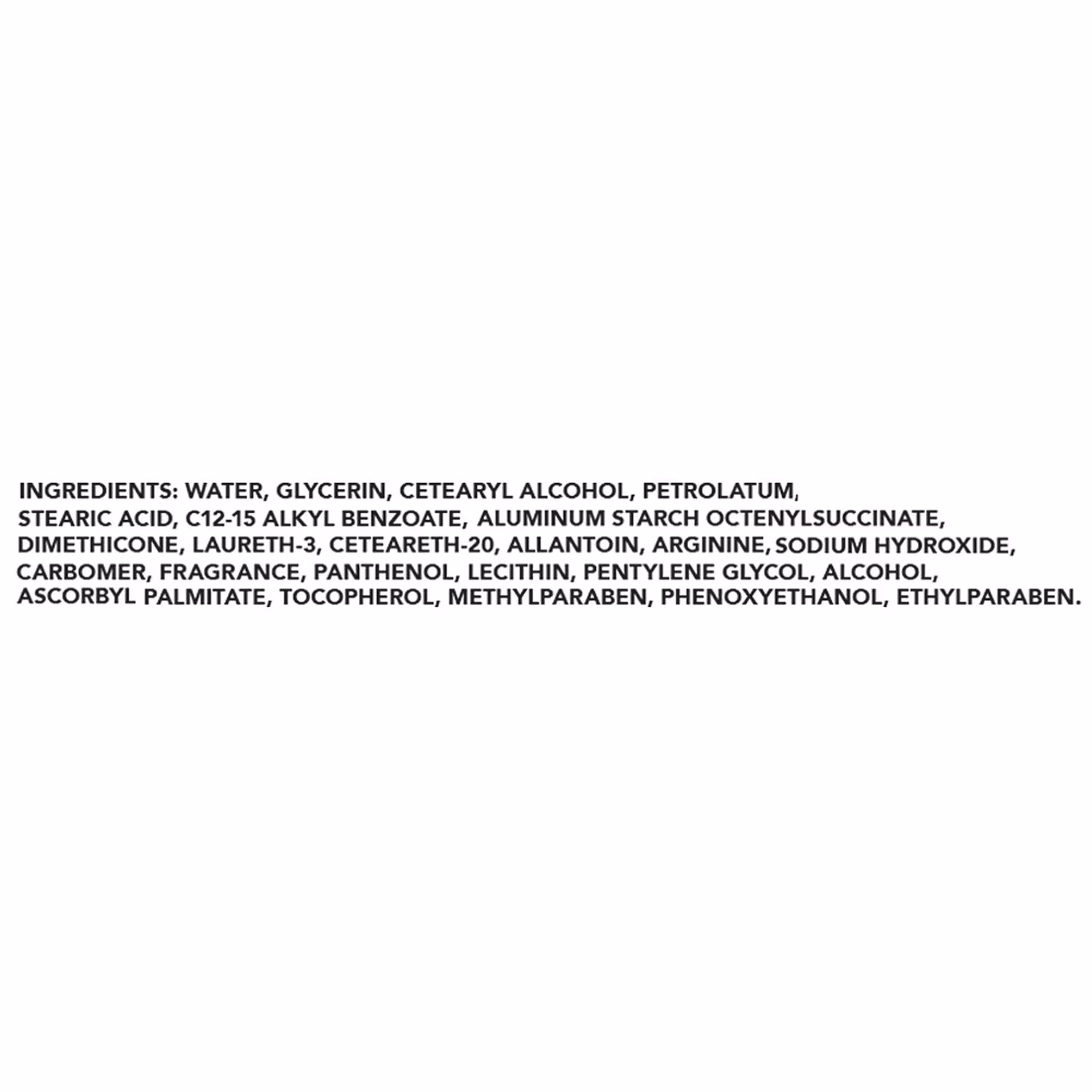 Ingredients: Water, Glycerin, Cetearyl, Alcohol, Petrolatum, Stearic Acid, C12-15 Alkyl Benzoate, Aluminum Starch Octenylsuccinate, Dimethicone, Laureth-3, Caprylic/Capric Triglyceride, Hydroxyacetophenone, Cetareth-20, Allantoin, Arginine, Sodium Hydroxide, Carbomer, Fragrance, Tetrasodium Glutamate Diacetate, Panthenol, Lecithin, Pentyene Glycol, Alcohol, Ascorbyl Palmitate, Tocopherol, Phenoxyethanol, Alpha-Isomethyl Ionone, Benzyl Benzoate, Citronellol, Hexyl Cinnamal, Linalool