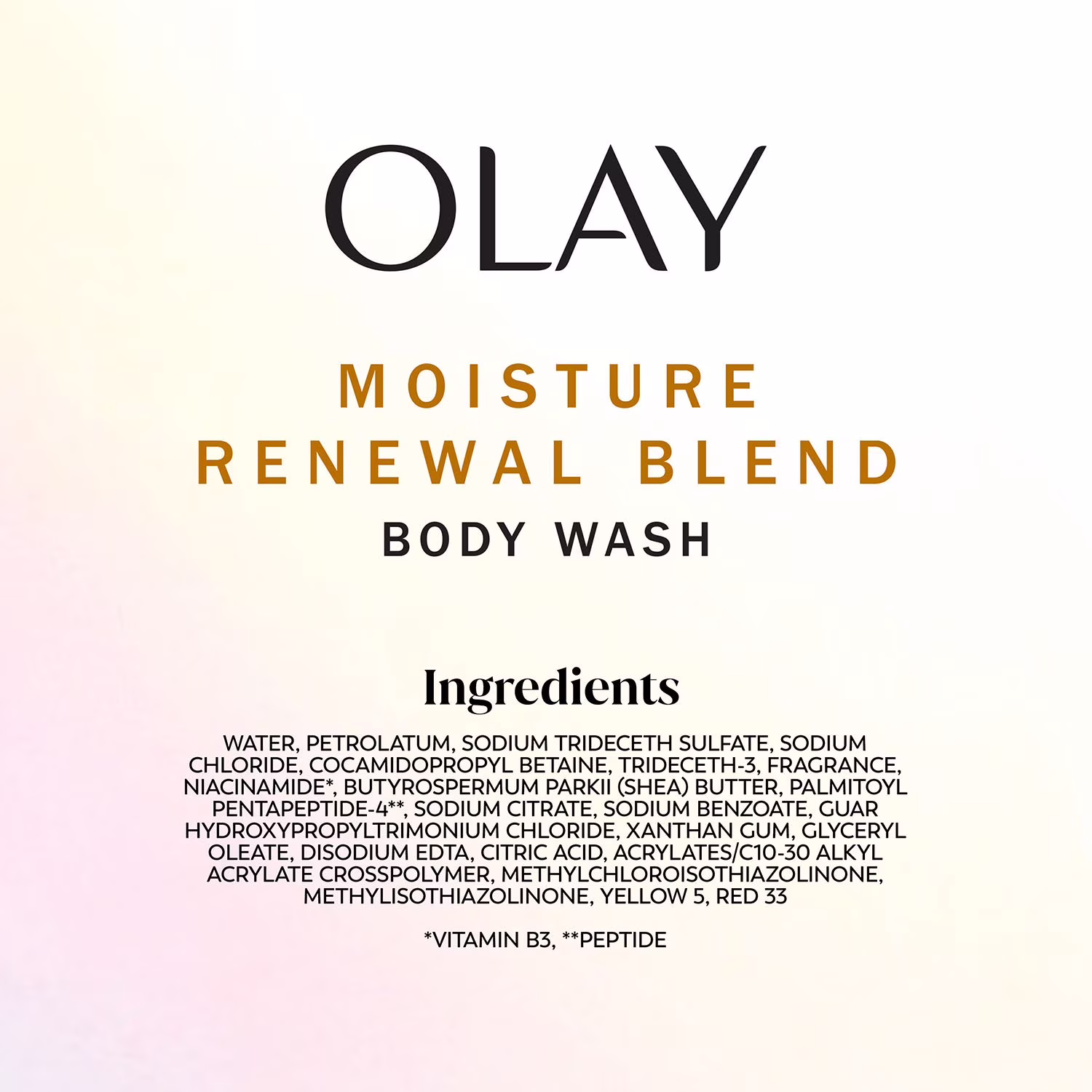 Ingredients: Water, Petrolatum, Sodium Trideceth Sulfate, Sodium Chloride, Cocamidopropyl Betaine, Trideceth-3, Fragrance, Niacinamide*, Butyrospermum Parkii (Shea) Butter, Palmitoyl Pentapeptide-4**, Sodium Citrate, Sodium Benzoate, Guar Hydroxypropyltrimonium Chloride, Xanthan Gum, Glyceryl Oleate, Disodium EDTA, Citric Acid, Acrylates/C10-30 Alkyl Acrylate Crosspolymer, Methylchloroisothiazolinone, Methylisothiazolinone, Yellow 5, Red 33