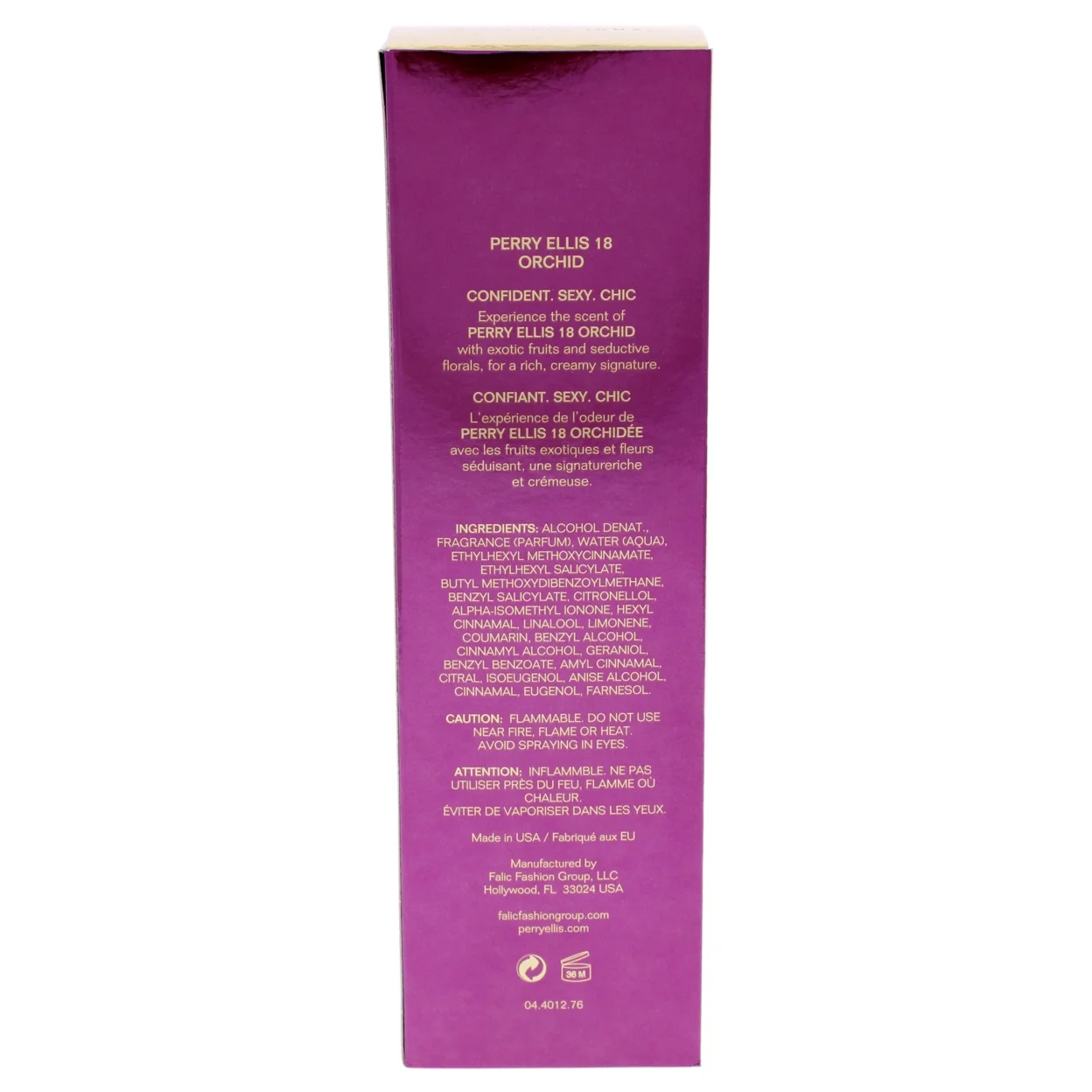 Launch year: 2006. Fragrance Family: Amber Floral. Top notes: Frozen pear, Raspberry mojito. Heart notes: Pink orchids, Nymphea. Base notes: Sandalwood, Vanilla. Design house: Perry Ellis. Design house category: fashion. Scent name: 18 Orchid. Gender: Ladies. Category: Fragrance. SubType: EDP Spray. Size: 3.4 oz. Barcode: 844061011823. Perry Ellis Ladies 18 Orchid EDP Spray 3.4 oz Fragrances 844061011823.